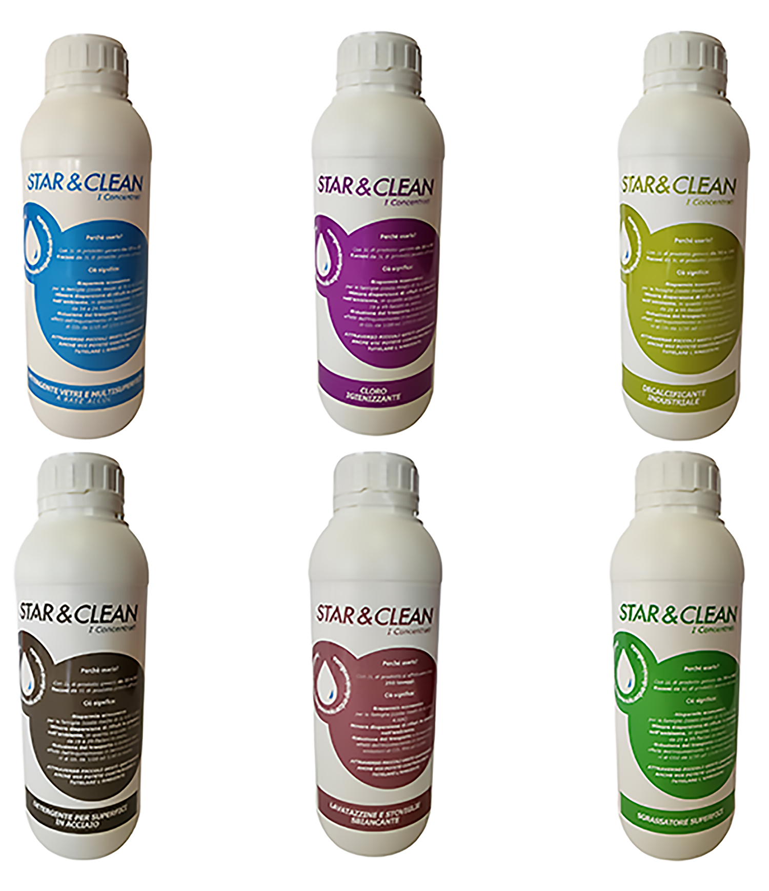 STAR&CLEAN è una linea di prodotti per la detergenza professionale sviluppata allo scopo di soddisfare le esigenze di un mercato in crescita e di rispondere alle richieste di utilizzatori sempre più attenti alla qualità dei prodotti e all'impatto sull'ambiente. Nel catalogo sono presenti numerose referenze, specifiche in base ai settori di utilizzo che si possono classificare in due grandi macro categorie : settore industriale per il trattamento e la risoluzione delle problematiche dovute ad uno sporco ostinato che i comuni detergenti pronti all'uso non riescono a contrastare, e settore sanitario- o più in generale quello degli enti pubblici – per contrastare la diffusione e promuovere il contenimento del Coronavirus. Le formulazioni sono state sviluppate a seguito di un'accurata ricerca degli ingredienti allo scopo di realizzare prodotti rispondenti ad elevati standard di qualità ma che allo stesso tempo rispettassero i CAM ( criteri ambientali minimi).